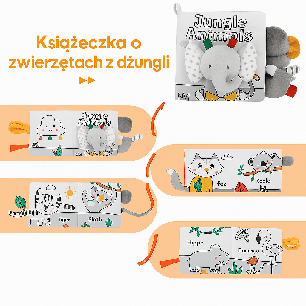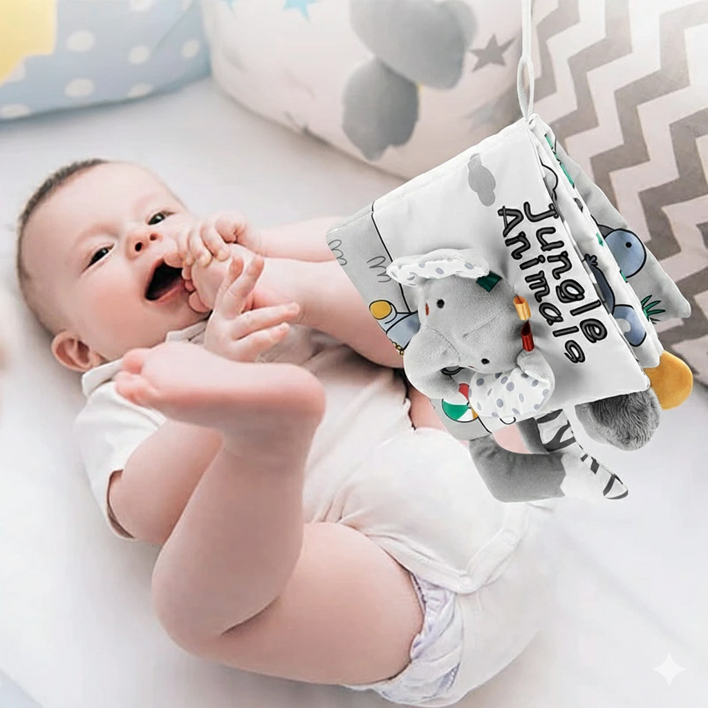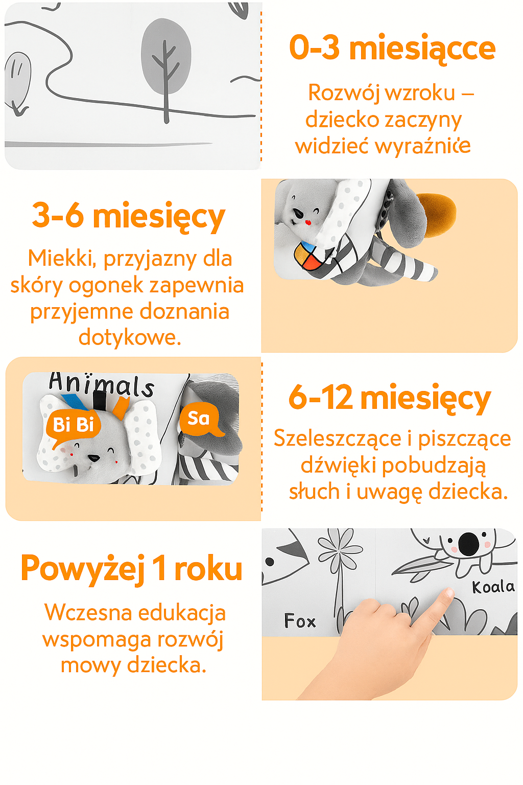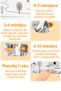 Każda strona oferuje różnorodne bodźce dotykowe i dźwiękowe – wbudowana grzechotka, szeleszczące elementy i urządzenie „BB” przyciągają uwagę malucha. Miękkie, wypukłe kończyny zwierzątek 3D rozwijają zmysł dotyku i koordynację ruchową podczas zabawy.